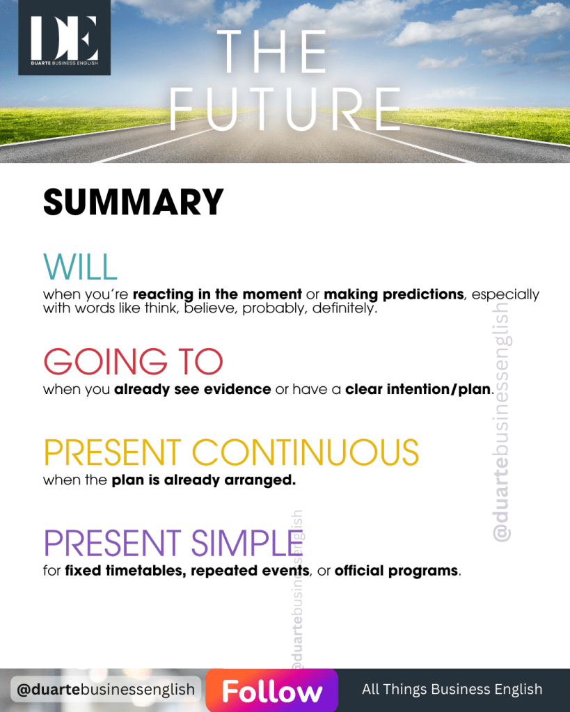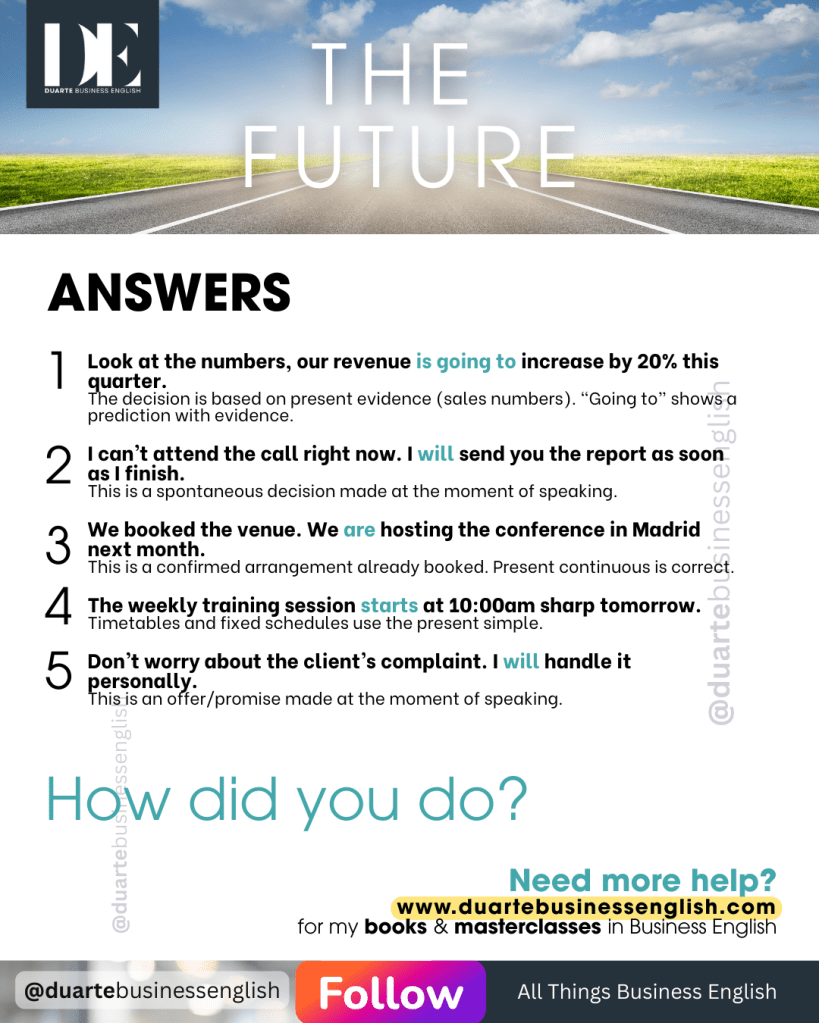 When talking about the future in Business English, we often choose between will, be going to, present continuous, and present simple. Each form carries a slightly different meaning depending on certainty, intention, evidence, or context.